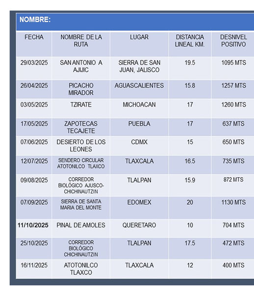 3. Al inicio y final de la ruta este pasaporte será sellado/firmado por el Comité Organizador. En el mismo se anotará la distancia lineal y desnivel positivo, datos que servirán en caso de que haya empate al final del año.